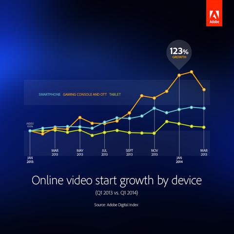 Gaffney說雖然大部分的增長都來自于游戲機,但這個類別里還包括像Apple TV、Roku和Chromecast這樣的設備。Adobe表示,這個數字太小以至于不能單獨成一類別,我好奇的是如果他們持續增長,那么又將有多少數字是由附加設備貢獻的呢?